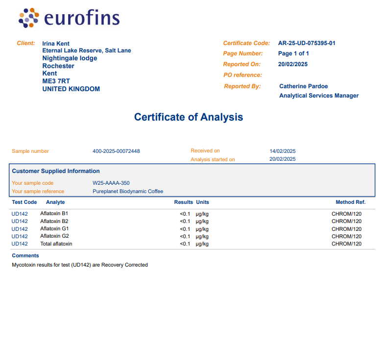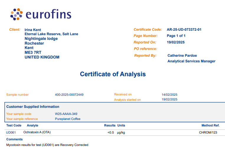 Pureplanet Natural Coffee is independently tested and certificated for Ochratoxin A (OTA) and Aflatoxins B1,B2,G1,G2 HPLC.